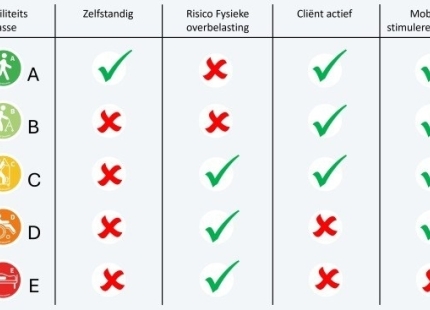 In de praktijkrichtlijnen worden cliënten ingedeeld in hoeveel ze nog zelf kunnen. Dat zijn de zogenoemde mobiliteitsklassen. Als een cliënt zelf kan meehelpen tijdens een transfer of handeling, dan is de kans dat een ADL-assistent overbelast raakt kleiner, dan wanneer een cliënt weinig meer zelf kan. Cliënten van Fokus zitten met name in de mobiliteitsklassen C, D en E. Zoals je in de middelste kolom op bijgaande afbeelding kunt zien, geeft dat een risico voor overbelasting van de ADL’ers.
