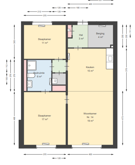 Het betreft hier een driekamerwoning op de tweede verdieping. De woning heeft een woonkamer met open keuken en er zijn twee slaapkamers. Er is een badkamer en een bergruimte op de begane grond voor bijv. een scootmobiel o.i.d.
