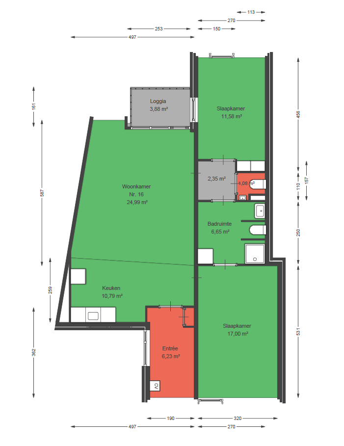 Deze woning op de eerste etage, heeft een woonkamer met open keuken, twee slaapkamers en een badkamer met wastafel, douche en toilet. Op de plattegrond vindt u de indeling van de woning.